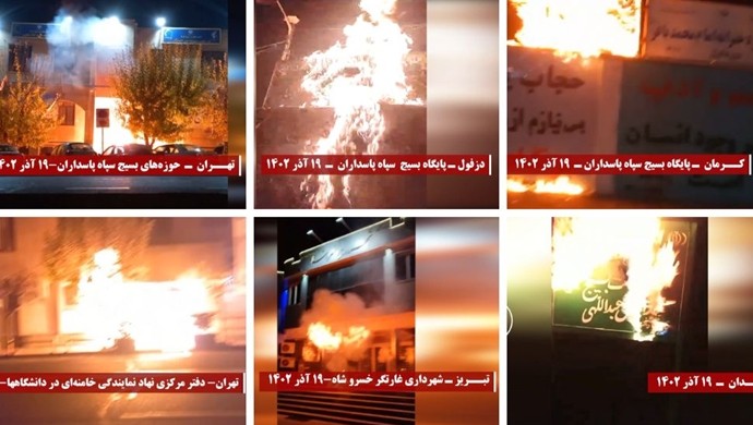 The rebellious youth targeted dozens of Basij bases. In Tehran, the youth targeted several Basij buildings by setting fire to the entrance signs and throwing Molotov cocktails at the buildings. The youths in Tehran also set fire to the entrance signs of the headquarters of State Security Forces, one of the main repressive forces involved in the crackdown on popular protests.
