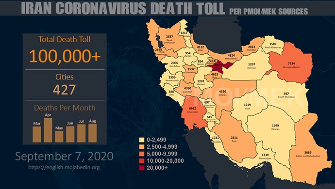 Iran, September 7, 2020—Over 100,000 people have died of the novel coronavirus in 427 cities checkered across all of Iran’s 31 provinces, according to reports tallied by the Iranian opposition People's Mojahedin Organization of Iran (PMOI/MEK) as of Monday afternoon local time, September 7. The official death count declared by the regime stands at 22,410, around a fifth of the actual figure.