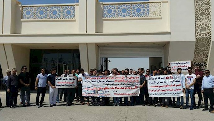 Iran, July 8, 2019 – On Sunday, owners of imported vehicles gathered in the Arvand region to protest against the delay of the release of their purchased vehicles. The protesters held banners that read, "It's been more than 18 months that our vehicles have been kept in customs of Khorramshahr for no reason. What is our crime? You have taken the customs fee, why aren't you releasing our cars?"
