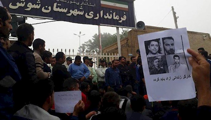 Workers of Haft Tapeh protesting in front of the Shush mayors office. The banner reads: Thieves are free, workers are in prison. We will stand till the end