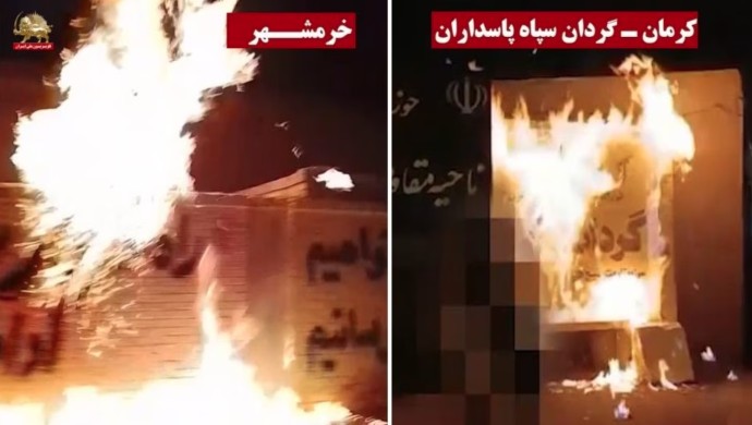 In parallel with attacks on physical bases, the Rebellious Youth set fire to the symbols of the regime’s leadership. Across the country, banners and billboards featuring regime supreme leader Ali Khamenei, the eliminated terror master Qassem Soleimani, and the executioner Ebrahim Raisi were set on fire.