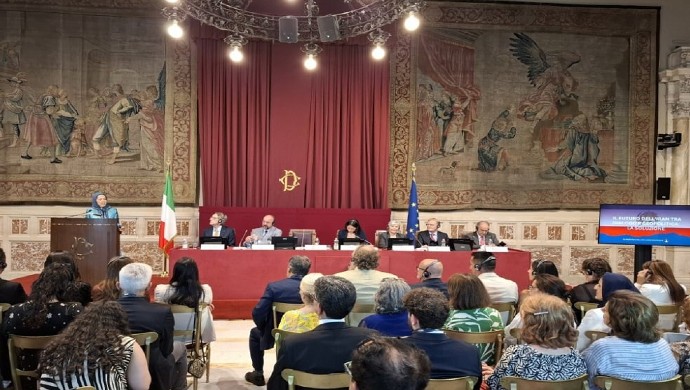 In her keynote address, Mrs. Rajavi thanked the Italian legislators for their focus on the “critical and urgent situation unfolding in Iran.” She began by honoring the recently executed PMOI members, Behrouz Ehsani and Mehdi Hassani, framing their deaths not as a sign of the regime’s strength, but of its desperation in the face of growing popular dissent. “Indeed, this regime—teetering on the edge of collapse—resorts to executions as a desperate response to the growing support among Iran’s youth for the PMOI,” she stated.