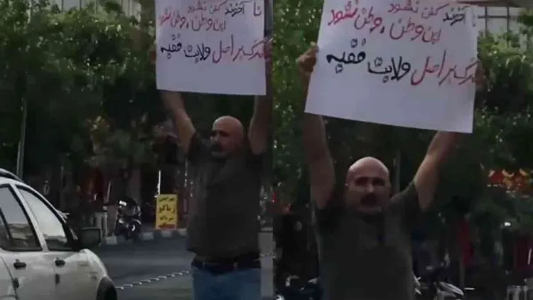 Moments earlier, Kashani had raised a handwritten placard reading “Death to the principle of the Supreme Leader” and chanted “Death to Khamenei.” A second slogan on the sign declared, “Until the mullah is shrouded, this homeland will not be free.”