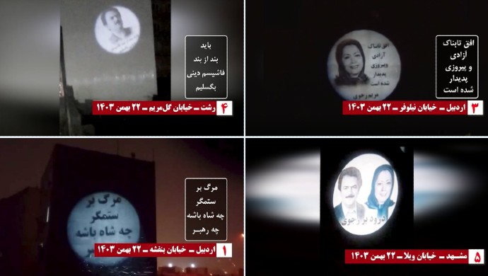 In Mashhad (Vila Street) and Meshginshahr (Allameh Street), images of the Iranian Resistance leaders were projected, accompanied by the message: “Hail to Rajavi!”—a clear testament to the Iranian people’s support for the leadership of the resistance in their battle against dictatorship.